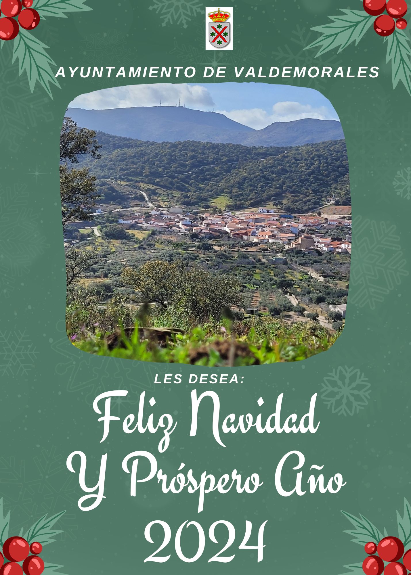 En nombre de la Corporación Municipal del Ayuntamiento de Valdemorales les desean, a tod@s los vecin@s de la localidad y paisanos distribuíd@s por las distintos pueblos, ciudades y Comunidades Autónomas, que pasen una Feliz Navidad y Próspero Año Nuevo 2024.